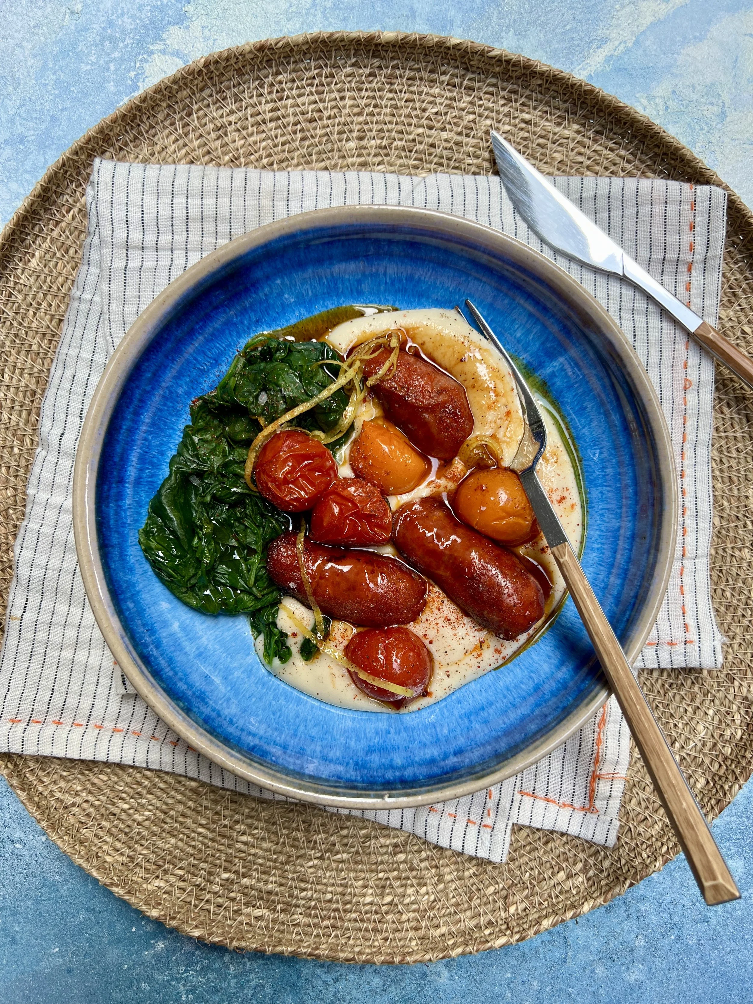 - To serve, spoon the mash into the base of two serving bowls, top with the spinach, chorizo and cherry tomatoes. Drizzle with the reserved oil and lemon zest. Sprinkle over a little sweet smoked paprika and serve with crusty bread. - Serves 2