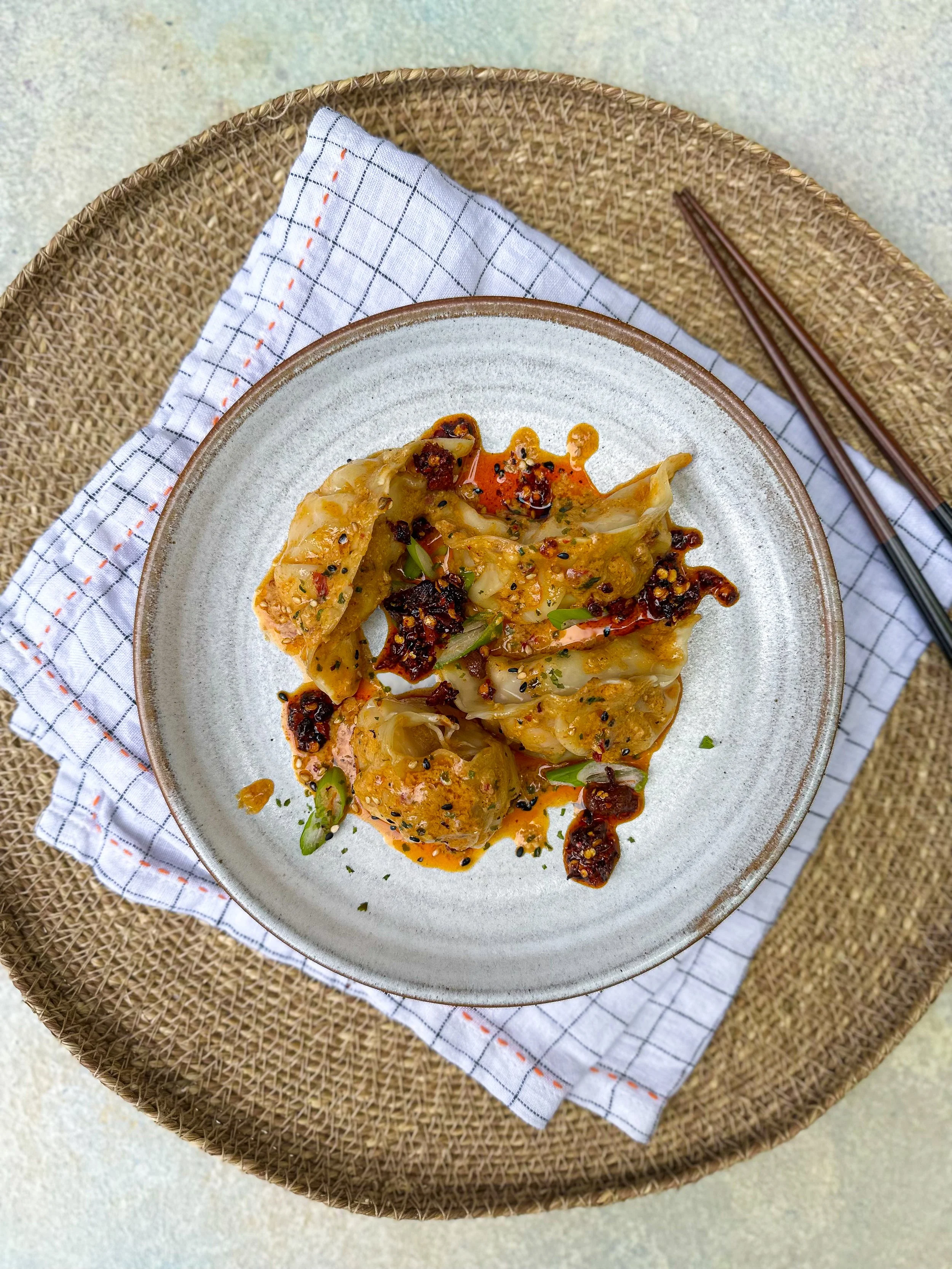 Prawn dumplings with spicy crab butter & crispy chilli in oil